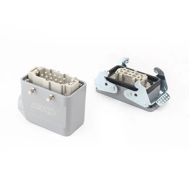Този CHTAR 10-пинов TS съединител за тежък режим на работа се използва широко с HE HD HEE, HDD. Това е основа и женска част от корпуса на тежкотоварни конектори. Изработена е от алуминий и е проектирана като единична катарама. Удобен за потребителя тип тежкотоварен клемен блок.
