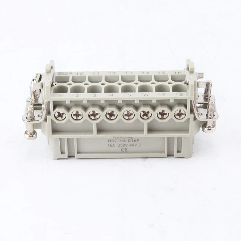 16A 10-щифтови конектори за тежък режим на работа са женски и мъжки инертни части. HA-016-M и HA-016-F са мъжка и женска част, съчетават се в комплект. Работят заедно с алуминиев корпус на H16A. Компонентите на вложката и външният корпус заедно образуват цялостен съединителен продукт. Изработени са от PC корпус и месингови щифтове със сребърно покритие. Сребърните щифтове го правят добри електрически връзки.