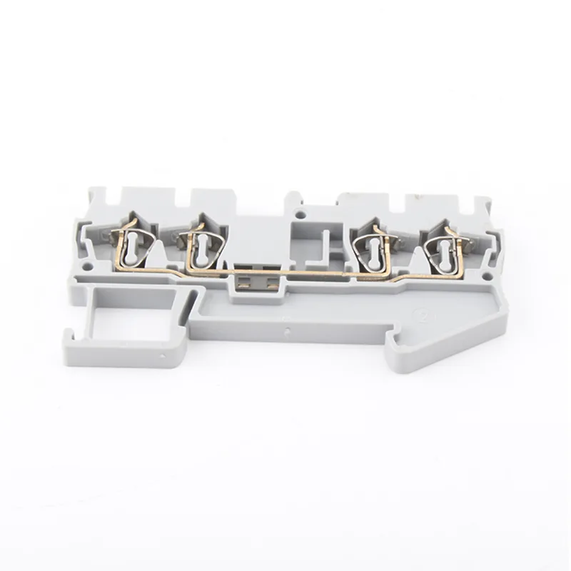 Клемните блокове ST2.5 QUATTRO с пружинна DIN релса са устройства за електрическо свързване, обикновено монтирани на релси в контролни шкафове или оборудване за бързо окабеляване и поддръжка. Клемните блокове обикновено са оборудвани с изолационни материали и физически изолиращи структури за предотвратяване на късо съединение, токови удари или разхлабени кабели, като по този начин повишават безопасността на системата.